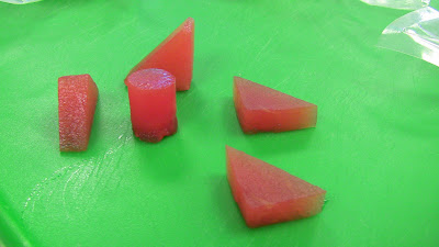 This has to be one of my favourite dishes from Under Pressure. The process of vacuum packing melon produces truly great results, watermelon especially benefits from this process. The melons become firmer and take on a deeper colour, the watermelon looks like raw sushi grade tuna (there is a play on fruit sushi to be developed here)! The original recipe calls for cucumber sorbet, but as we were in strawberry season (and I don't really like cucumber) we altered the dish slightly. We used small square and round cutters for most of the shapes, although some need to be done by hand to save on waste (we used our off-cuts for a melon sorbet). Watermelon is easily cut into rectangles that then yields nice even shapes, the honeydew and cantaloupe melon were slightly more difficult to shape.