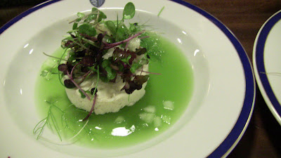 To begin today's lunch we served a crab tian dressed with grain mustard and creme fraiche. The tian was set on a light cucumber jelly garnished with dill and cucumber concasse. This is one visual dish! The cucumber juice is beautiful to look at and set's up lovely when gelled.Our main course was fillet of beef cooked sous vide to 58 degrees C for three hours; very, very tender. The beef is quickly pan-fried to add flavour moments before being sliced and served. To accompany the beef we served puree of pumpkin, spinach, fondant potato and a red wine jus. I was very, very happy with this dish and felt that the large plate showed the meat off very well; lots of autumnal colours and flavours!