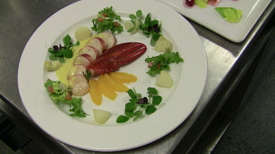 Tail and claw of lobster with orange, artichokes and petit herbs
