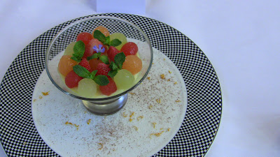 Three layer chocolate mousse with melon and strawberries