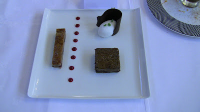 White chocolate torte, dark chocolate and pistachio torte and strawberries