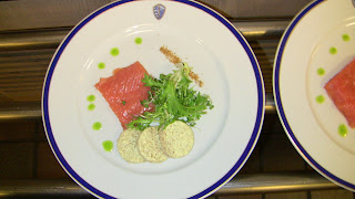 To begin we served cold smoked salmon, a speciality from the cold coastal waters of Scotland. Typically, smoked salmon is served with brown bread, butter and lemon. Our chefs produced a special citrus powder for last night's dinner, designed to highlight the subtle smoked flavour of the fish.