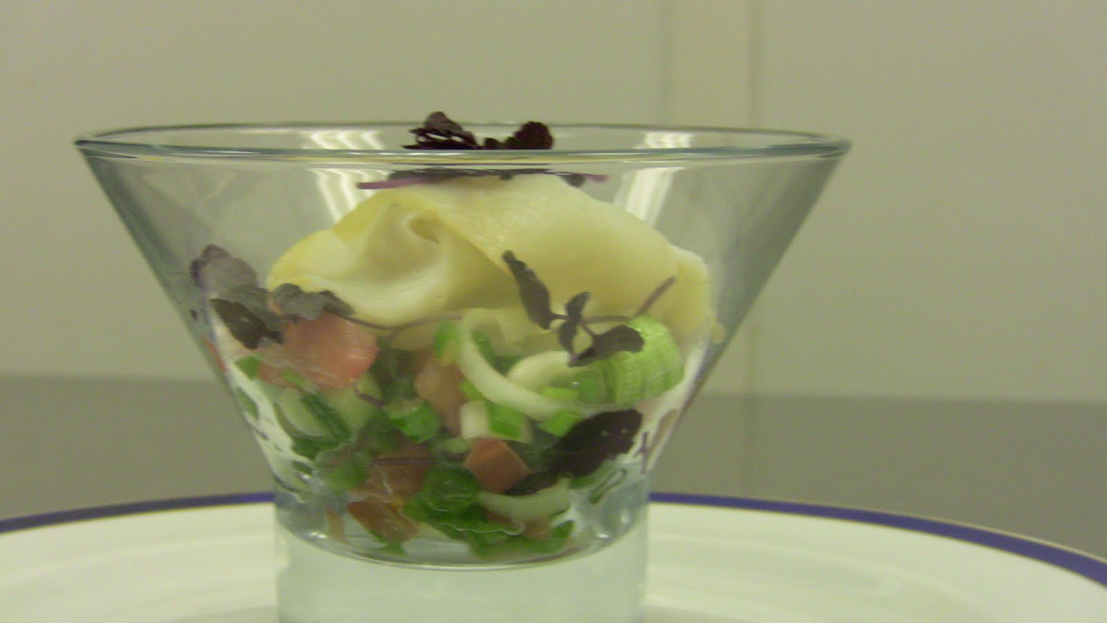 We began the feast with a chilled verrine of smoked halibut with lemon, tomato and spring scallions. This refreshing starter comes from Terrines and Verrines by Franck Pontais.