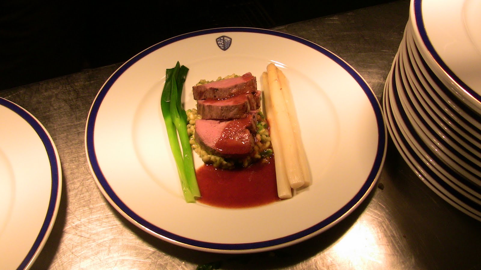 Following the verrine, we served roast fillet of beef with spinach risotto, white asparagus and spring onions. We cooked the beef sous vide at 60 C for three and a half hours. White asparagus, known as spargel, is cultivated by denying the plants light while they are being grown. Less bitter than the green variety, it is very popular in Europe. We cooked the asparagus sous vide with milk, sugar and salt, before finishing with butter.
