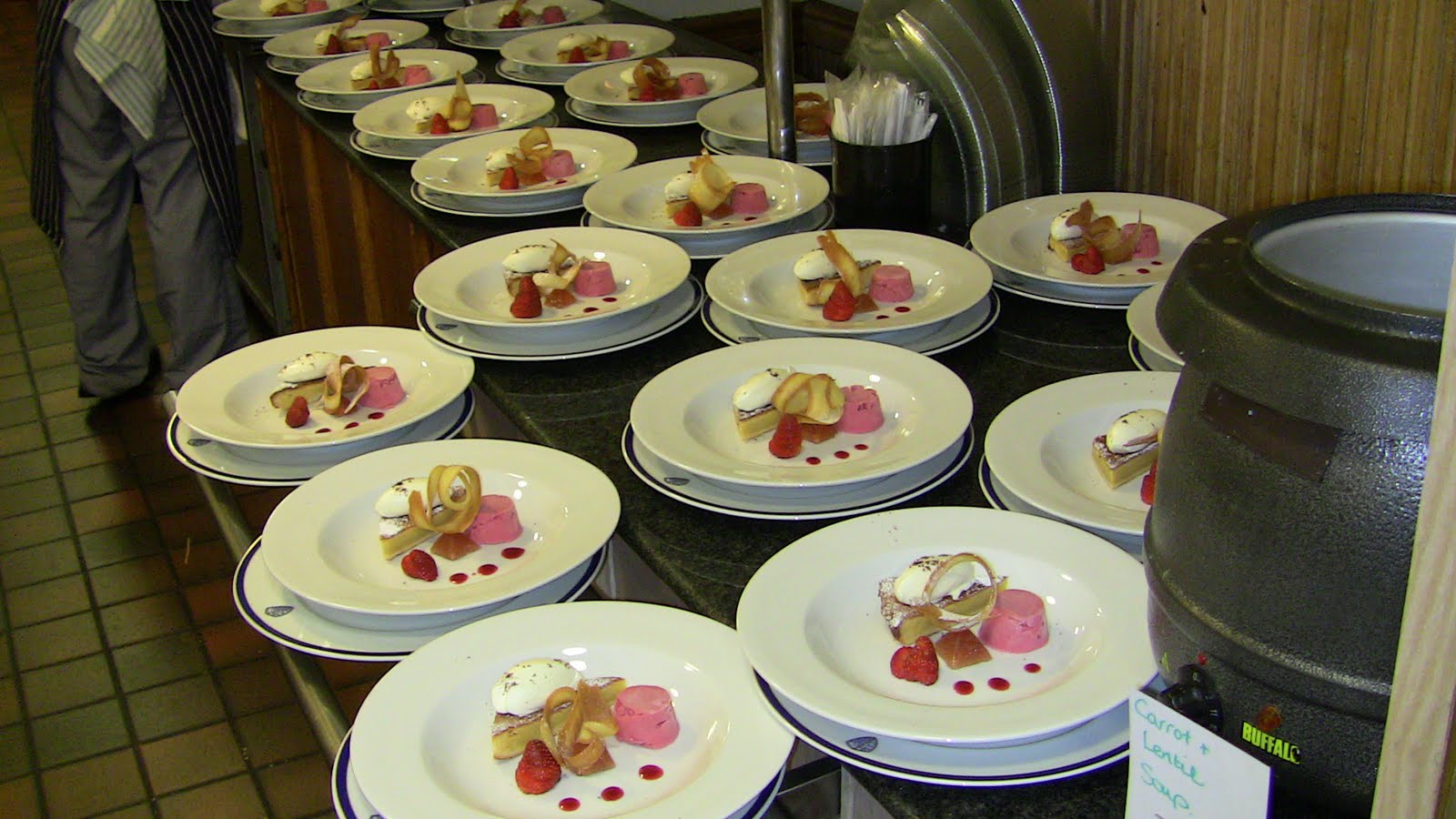 Following the cheese course we asked guests to clear the hall while we relayed for dessert. Dessert consisted of fresh fruit, petit fours, coffee, port wine and claret.