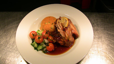 For a main course we served lemon and garlic roasted free-range chicken with harissa-spiced couscous, roasted cherry tomatoes and pak choi. The chicken was simmered in a lemon syrup prior to being roasted through the oven with fresh thyme.
