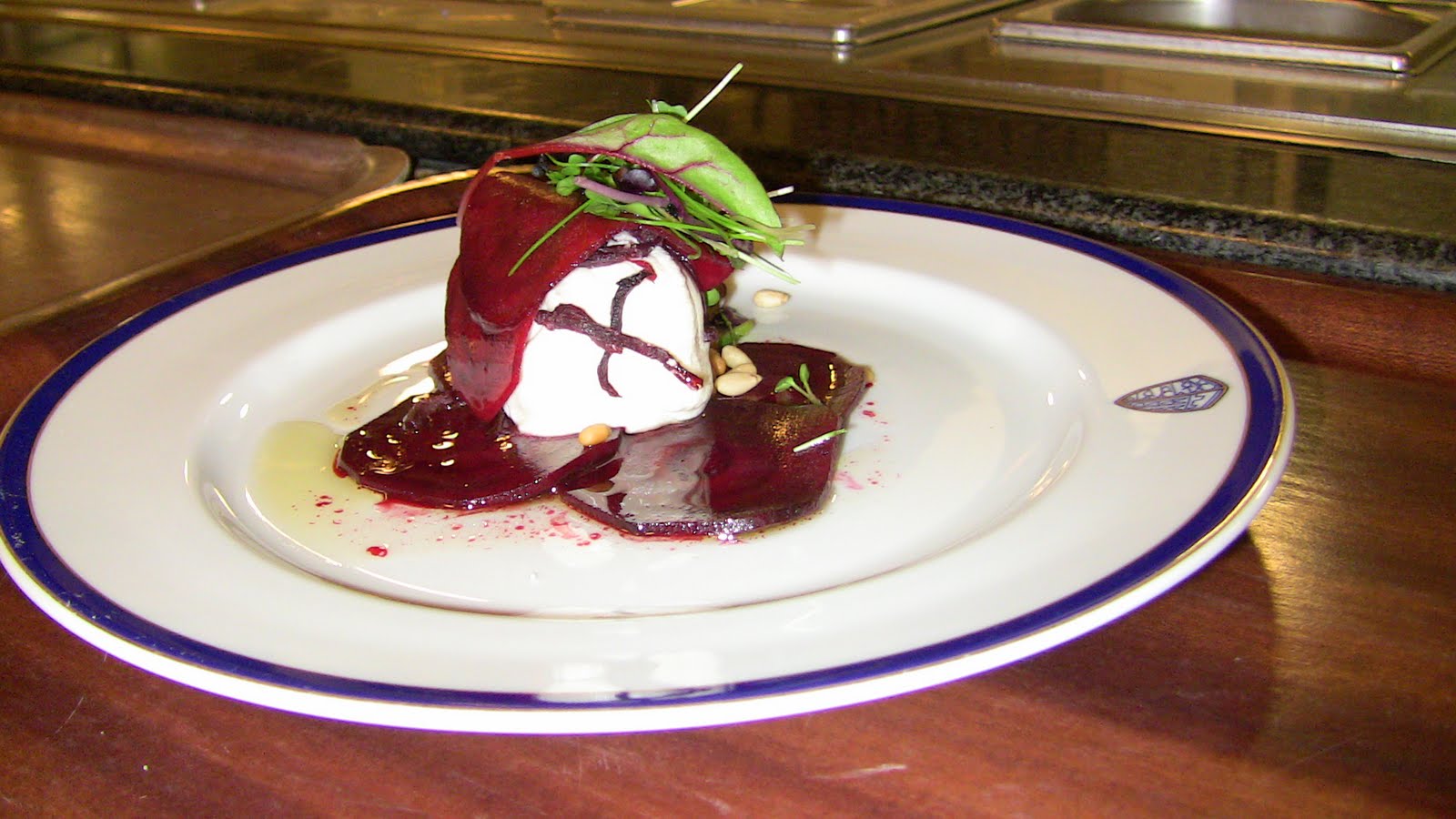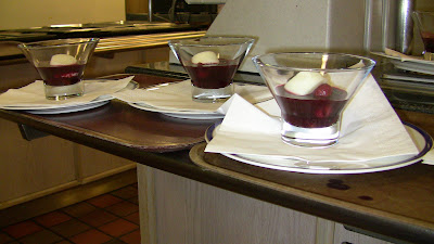 Last night's Formal Hall featured three wonderful recipes from the Maze cookbook by Jason Atherton. We began with marinated beetroot, goat's cheese, Swiss chard and beetroot dressing. The beetroot was marinated in Chardonnay vinegar, honey, thyme and sugar, before being topped with whipped goat's cheese, baton cut beets and the dressing.