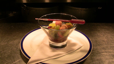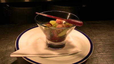 For last night's sweet we again drew inspiration from Franck and his repertoire of great verrines. Grapes, blueberries and figs were softened in orange juice, port and sugar, whilst raspberries were coated in butter, pistachios and biscuit crumbs. As an added flurish, we served some extra sauce in small pipettes.
