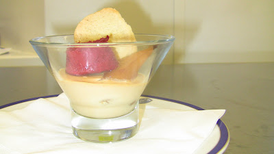 To end another lovely evening, we served poached pear with sable biscuit, caramel cream and blackberry sorbet. This is another great dish from Maze, by Jason Atherton.