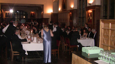The Stokes Society, founded in 1909 by six undergraduates who read papers to each other, has a long and distinguished history. In 1932 the first Annual Dinner was held (the second was to be 1945!). The speaker then read out a lecture about "Science in Nazi Germany" from the Minutes Book. After the 2nd World War the constitution was changed to allow for more than 24 members. The official tie was black showing a red golf ball dropping into treacle. Some ties appeared showing the 'F.ds' equation, probably from the Caius Green Society. Scarves appeared in the 80's, and were originally black with a light green stripe - you could get an extra wide one for an additional £1.