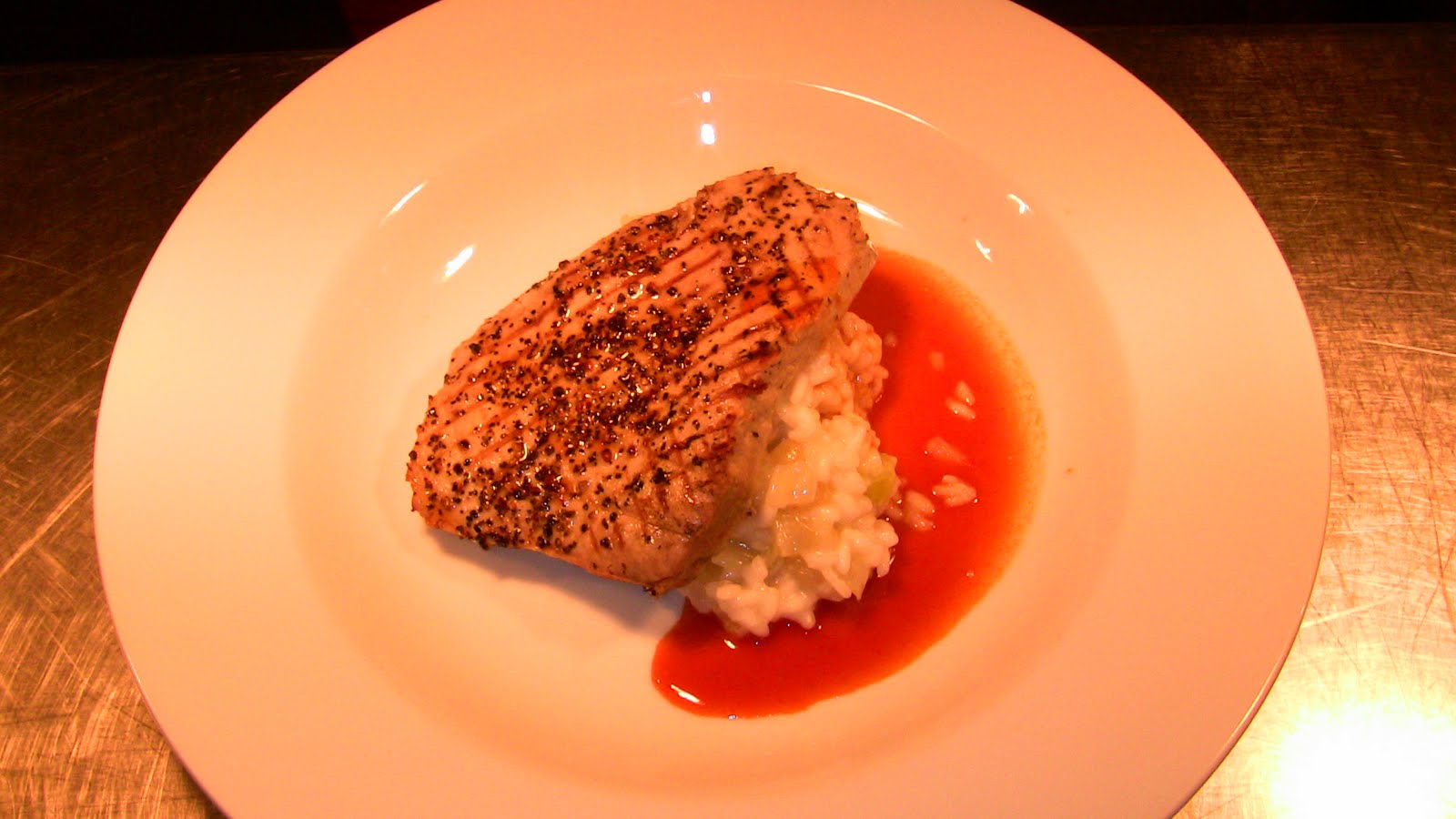 The main course of pepper crusted fresh tuna with fennel risotto and red wine sauce, is a recipe from the Pier cookbook by Greg Doyle. Pier is an award winning restaurant in Rose Bay, Sydney Australia.