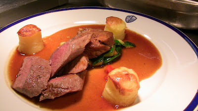 This main course took many hours to prepare; lamb shoulders were confited in olive oil for several hours, after which the meat was shredded, rolled into cylinders and refrigerated until firm. Each of the baby fondants were cut by hand from large potatoes, and the lamb loins were quickly roasted until medium-rare.