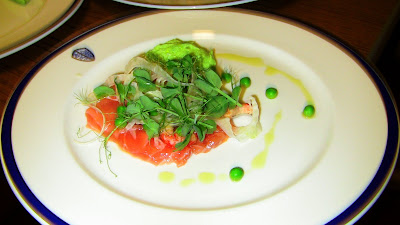 Our chefs prepared a wonderful dinner which began with a cured wild salmon, crayfish, pea mousse and fennel salad. This great dish came from the cookbook Pier by Greg Doyle.