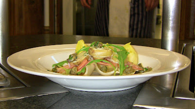 Last night's dinner began with an imaginative amuse bouche of deconstructed shrimp cocktail. Basically put, this small palate teaser contained all the ingredients found in the more traditional cocktail, but broken down into the individual components. This dish was meant as a bit of fun for the chefs, and hopefully was not viewed as being overly pretentious ;-)