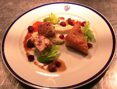 For the main course, we served Chestnut Stuffed Chicken with celery and honey poached cranberries. This very tricky recipe comes from Thomas Keller's book Under Pressure, and involves cooking boneless chicken legs, filled with a chicken and chestnut mousse, sous vide for 90 minutes and then pan-frying in clarified butter.